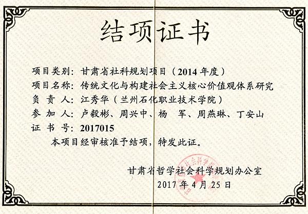 近日,甘肃省哲学社会科学规划办公室组织专家,对近年来多个立项项目进行了结项鉴定评审。由我校江秀华副教授主持,甘肃中医药大学、西北师范大学、我校等5位教师参与的甘肃省哲学社会科学规划项目《传统文化与构建社会主义核心价值观体系研究》顺利通过同行专家结项鉴定评审,获得了结项证书。