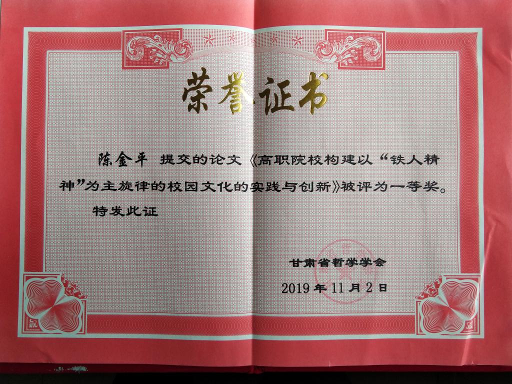 大会公布了甘肃省哲学学会2019年学术年会论文征集活动的评审结果,并进行了表彰。据了解,自论文征集活动开展以来,大会先后征集学术论文100余篇,经过专家严格评审,共评出12个一等奖。我校陈金平老师的文章《高职院校构建以“铁人精神”为主旋律的校园文化的实践与创新》获一等奖。