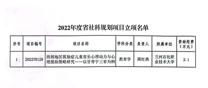 近日,甘肃省哲学社会科学规划办公室公布了《2022年度甘肃省哲学社会科学规划项目立项的通知》,我校yl6776永利集团教师周红燕副教授负责的《西部地区孤独症儿童家长心理动力与心理援助策略研究——以甘青宁三省为例》获批2022年度甘肃省社科规划一般项目,获资助经费3万元(第一次拨付2.1万元,预留经费0.9万元)。