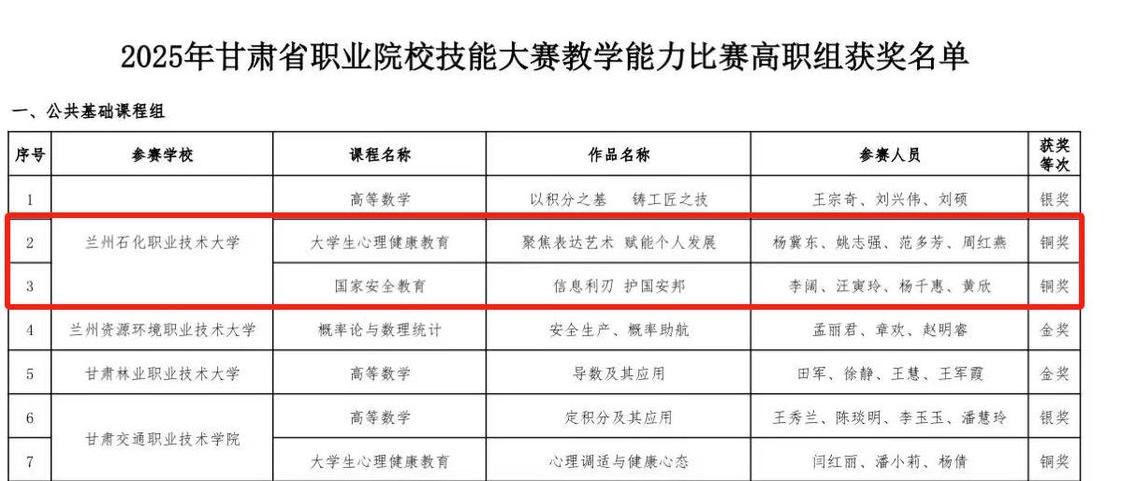 在喜迎第41个教师节的热烈氛围中,yl6776永利集团捷报频传。2025年7月,在甘肃省职业院校技能大赛教学能力比赛中,由杨冀东、姚志强、范多芳、周红燕四位老师组成的团队,依托《大学生心理健康教育》课程提交的作品《聚焦表达艺术赋能个人发展》,以及李阔、汪寅玲、杨千惠、黄欣四位老师依托《国家安全教育》课程完成的作品《信息利刃护国安邦》,双双斩获高职组铜奖。这份荣誉不仅凝结了两个团队数月以来的智慧与汗水,更是我院持续推进教学创新、注重师资培养的生动体现。