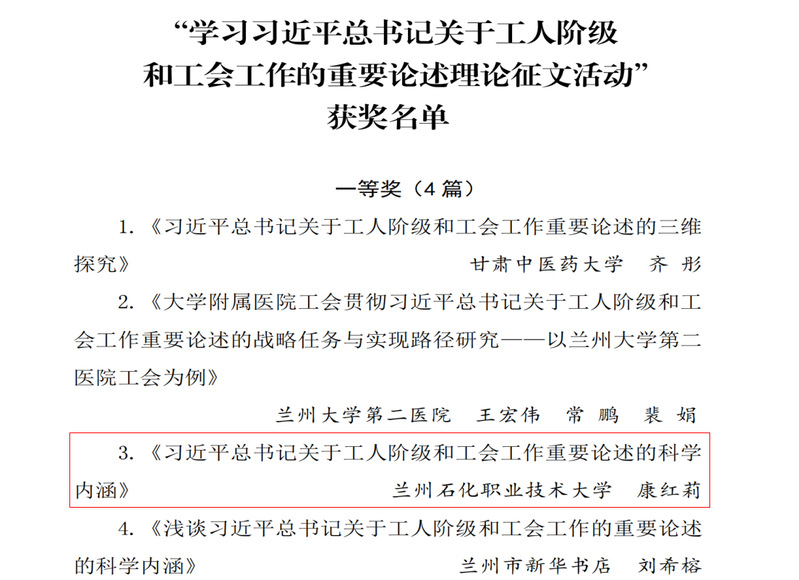 近日,甘肃省教科文卫工会委员会公布了“学习习近平总书记关于工人阶级和工会工作的重要论述理论征文活动”评选结果的通报。此次征文在活动期间共收到基层工会上报文章65篇,经专家评委评审、按照省总工会有关规定,共评审出一等奖4名、二等奖6名、三等奖10名。其中,我校yl6776永利集团康红莉老师撰写的《习近平总书记关于工人阶级和工会工作重要论述的科学内涵》一文,在此次征文活动中荣获一等奖。