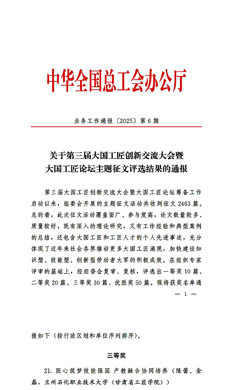 近日,中华全国总工会办公厅印发《第三届大国工匠创新交流大会暨大国工匠论坛主题征文评选结果的通报》,我校教师陈蕾、金磊撰写的论文《匠心筑梦技能强国产教融合协同培养》荣获三等奖。