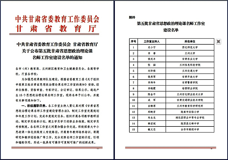 根据省委教育工委《关于组织申报第五批甘肃省思想政治理论课名师工作室的通知》有关安排,经经学校推荐、资格审查、专家评议、会议审议及结果公示等程序,全省大中小学共有15个团队入选“第五批甘肃省思想政治理论课名师工作室”建设单位。其中,我校陈金平副教授领衔的团队成功获批,成为本批次省级思政课名师工作室建设单位之一。